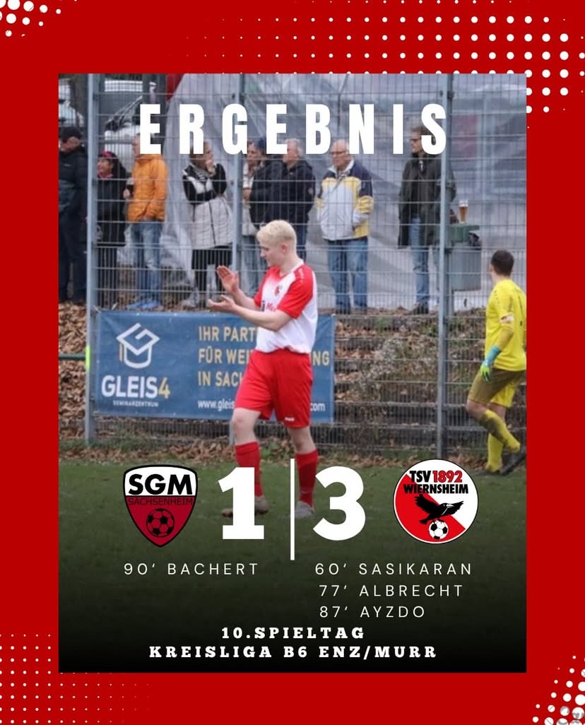Das Spiel war zwar noch nicht ganz entschieden, allerdings ließen die Wiernsheimer defensiv weiter nichts zu und wurde mit ihren Kontern immer gefährlicher. Angepeitscht von unseren Fans und den Spielern unserer Zweiten erlief Ayzdo einen Steilpass, umkurvte den Sachsenheimer Torwart und schob den Ball ins verwaiste Tor zur endgültigen Entscheidung ein. Kurz vor Schluss war unsere Verteidigung dann einmal unaufmerksam und die SGM erzielte in der 90. Minute den Ehrentreffer. Trotz dieses Schönheitsfehlers war der Sieg am Ende nicht mehr in Gefahr und unsere Jungs fuhren den 3:1 Auswärtssieg ein.